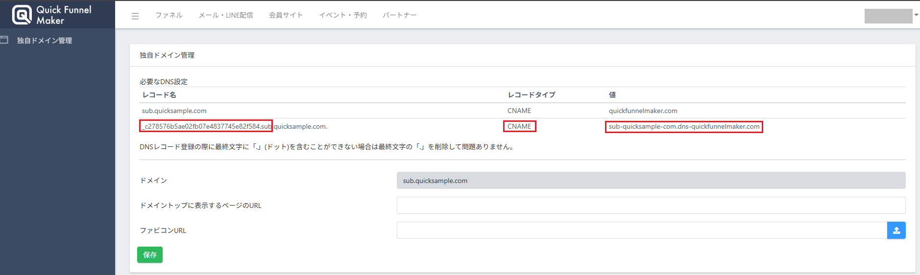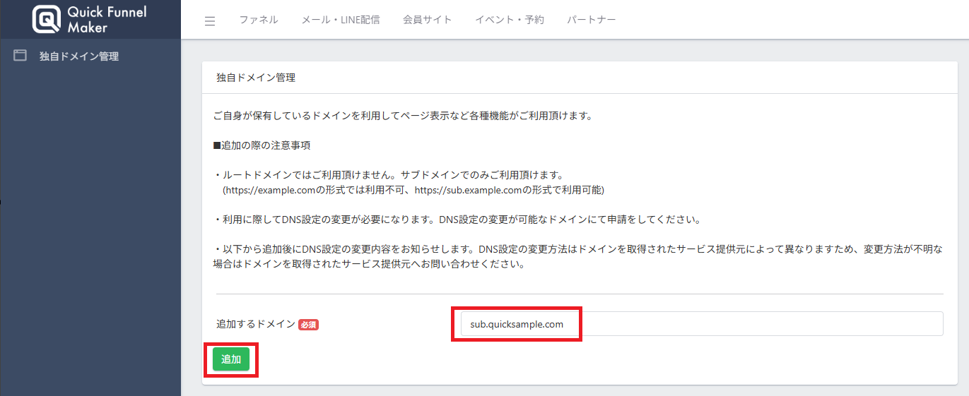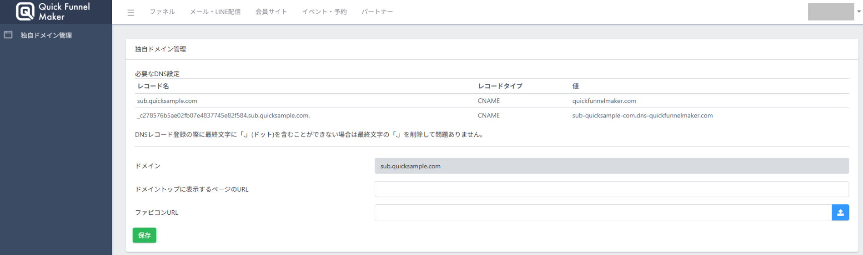 例)Quick Funnel Maker独自ドメイン管理に「sub.quicksample.com」と登録している場合