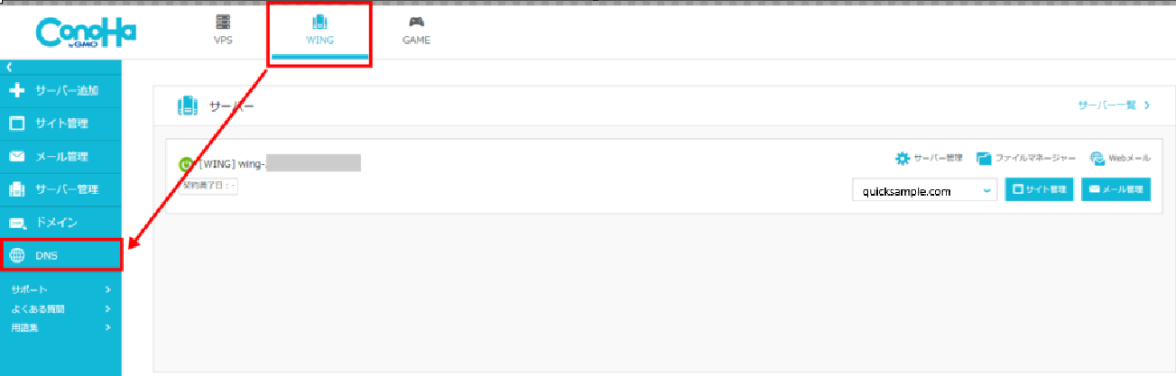 1.「ConoHa WING」コントロールパネルにログイン > 「WING」 > 左メニューの「DNS」をクリック