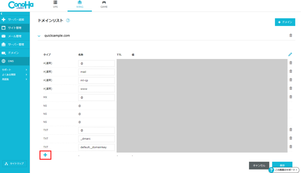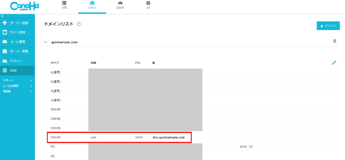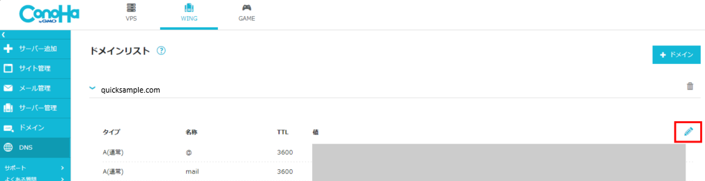 引き続き、Step2のConoHa WING側でのDNSレコードの追加操作を行います。