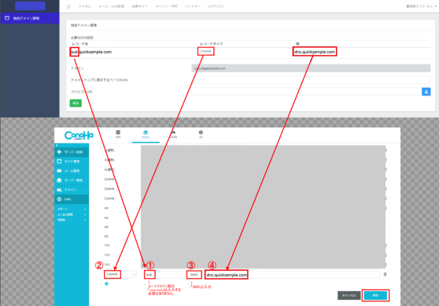 ※上記(sub、dns.quicksample.com)は設定例となりますのでそのまま入力しないでください。