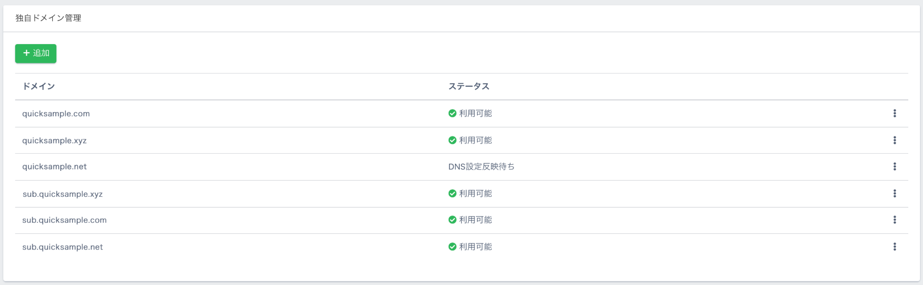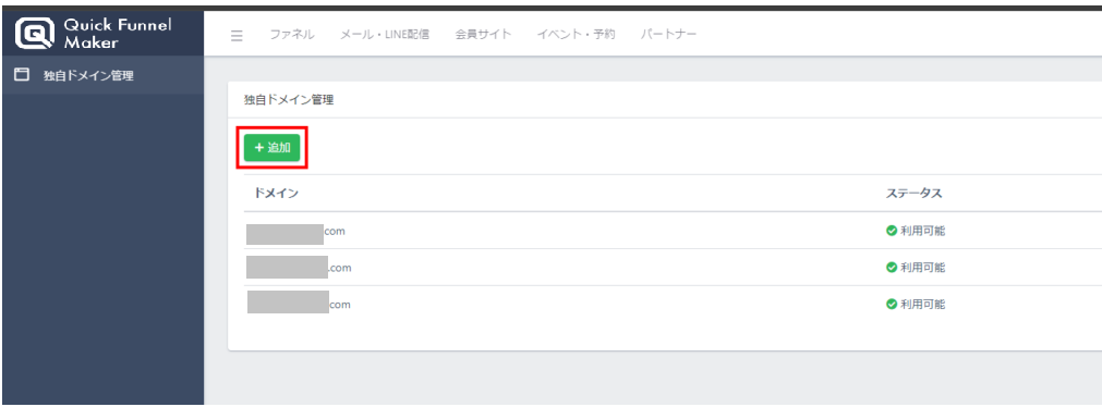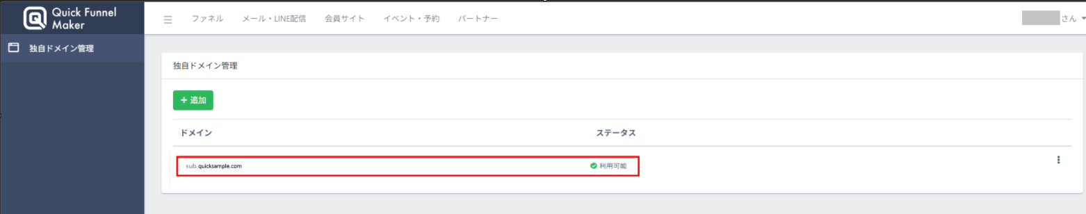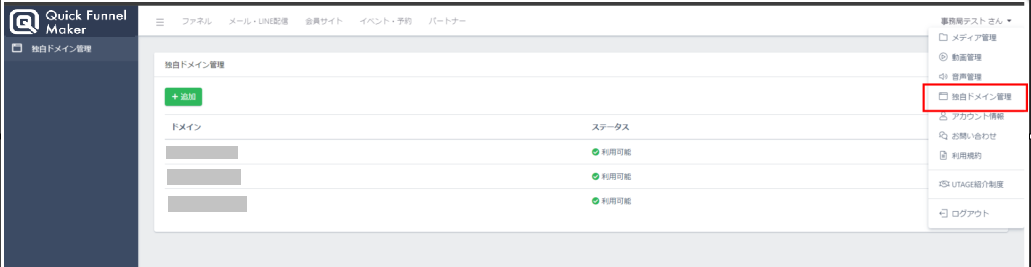 7.Quick Funnel Maker > 独自ドメイン管理 にてDNS設定の変更が確認されますとステータスが「利用可能」になります。